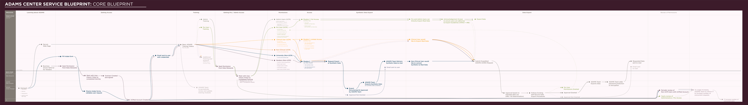 The core blueprint shows all the user types, permissions paths, and actions that can be taken within a single document. In this way, it highlights the process for different types of users to access different kinds of data, as well as the back-end tasks that need to be undertaken to grant access or to approve data requests.